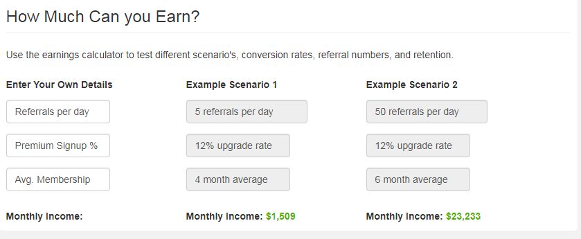 I have given an example how you can use this go through scenerios of how much you can earn. In this example: I left the detials as default ( referals per day, premium sign up % and avg membership) then I just used 5 as an example of how many referrals a day, and the second on I used 50 referalls a day.