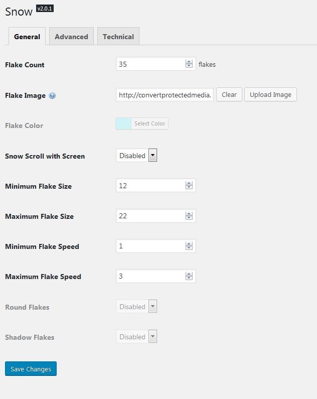 Then upload the image in the plugin settings. If you use your own image, be sure it's a transparent png file. If you don't want to use an image at all, you flakes will be either square or round depending on the setting you use. Here are my settings:
