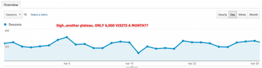 This stage is where your growth might slow a little bit. It can be anywhere from 10-30 visitors a day and you will have the same number for the loooooongest time, but soon enough you'll make another post that gets some good ranking, and your traffic will move up again by 10-20 daily visits.....until you hit another plateau. I hate those plateaus.