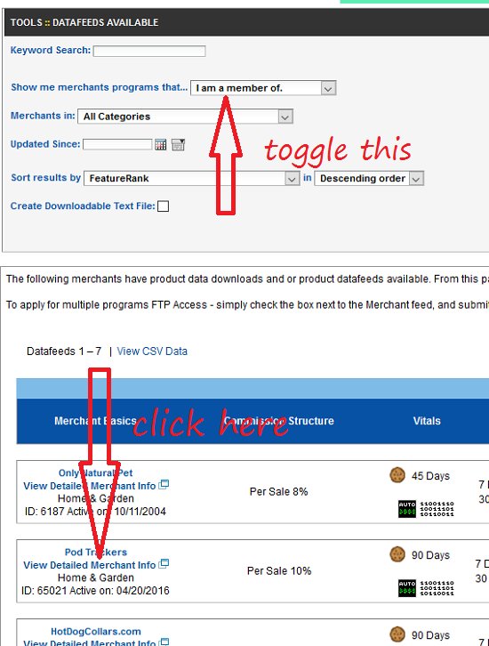 You are almost to your ShareASale affiliate links. Toggle the merchants program box to show "I am a member of" Click refresh button (not shown due to size constraints) but it is there. Find your approved merchants click "view detailed merchant info".