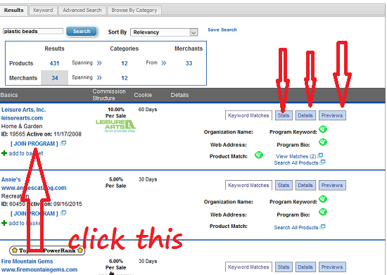 After entering your keyword click the search button. And up pops this next screen. There is a lot of information here. You can see the number of products that match your keyword, and the number of merchants that carry that item. In the "stats" tab you can find information on average commissions. The "details" tab" will let you know if the program is auto-approve, cookie retention, and other aspects of ShareASale. The "preview tab" will give you a quick overview of the products carried. Check out all the merchants find the best fit for you and your niche and click "Join Program".