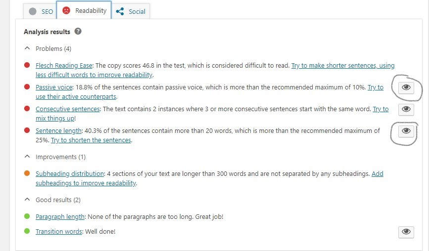 2- Scroll down and you will see all the problems you might have! and if you press on the (Eye icon) it will highlight the problem inside your article and then you can do the fix! In addition they provide articles about all these problems and how to fix them AND you can always google to learn about these things.