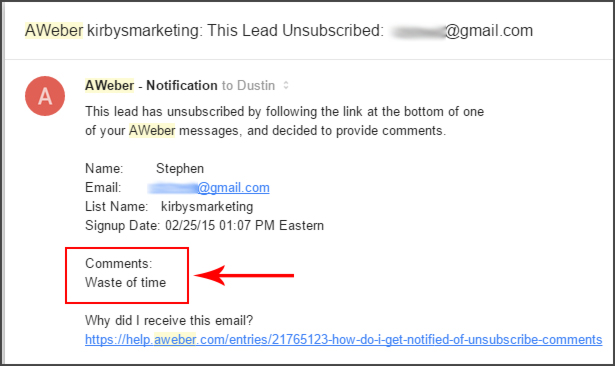 Anyways, today I got an email saying a lead had unsubscribed. I was a little bummed, but when I opened the email and saw his comment I was actually kind of hurt and disappointed. Here is the email: