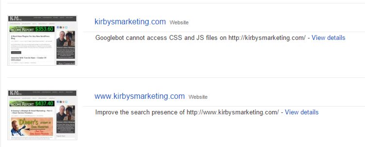 The "www.kirbysmarketing.com" thumbnail is the most up to date version of my site. The "kirbysmarketing.com" thumbnail has not been updated since my last post a couple weeks ago.
