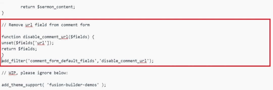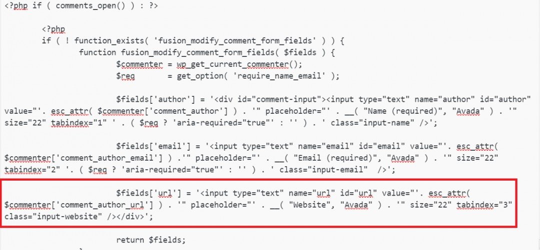 // $fields['url'] = '<input type="text" name="url" id="url" value="'. esc_attr( $commenter['comment_author_url'] ) . '" placeholder="' . __( "Website", "Avada" ) . '" size="22" tabindex="3" class="input-website" /></div>';