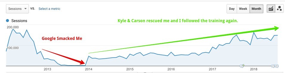 That decline in traffic totally changed my life and that of my family. It was a very dark time. It made me re-evaluate this business and things in my life. I had given up. Then one faithful day Kyle and Carson reached out to me. They wondered why I had stopped. I told them what happened. And they were like dude, you're fine. You can come back. And they literally helped me get back on track. I started to write content again and apply what they taught in the training. And as you can see over time my traffic and income came back. That's what WA can do for you.