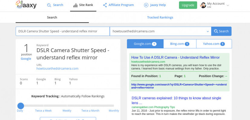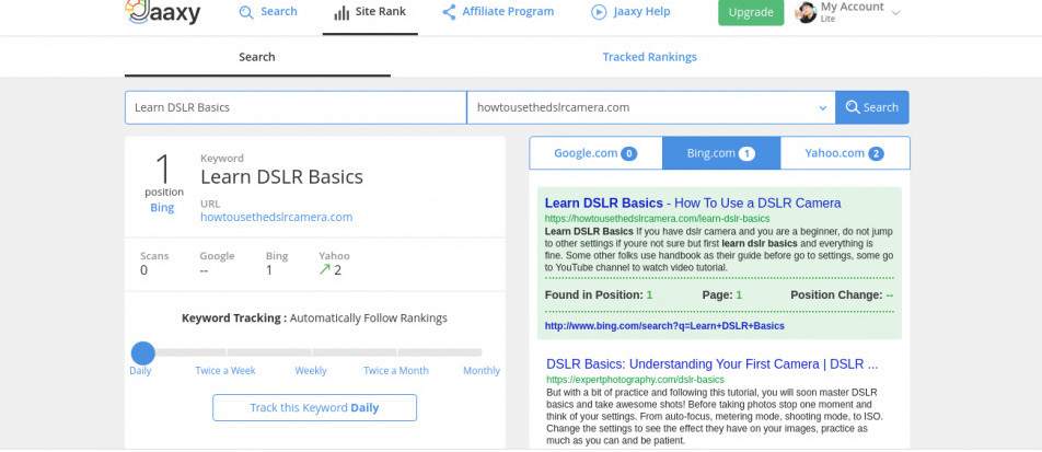I check today in Jaaxy site rank, and what I saw is amazing. First page in Bing and place in number 1. And look in Yahoo it moves up to 2nd place, also in page 1.