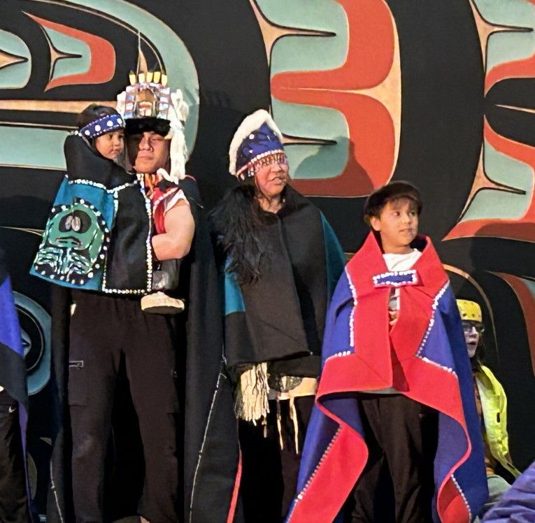 Notice the boy in the yellow hat at the left? He had a physical disability and needed a guide dog. The Tlingits invited him onto the stage for the picture taking session at the end.