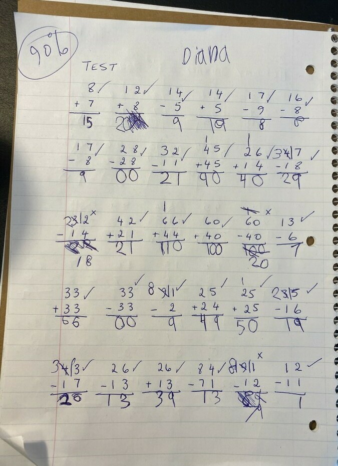 I gave her a Math test a couple of days ago and thought her progress was pretty good. It was a mixture of addition and subtraction sums. I walked away when she did this test. I was delighted that she got 90% right. She then corrected the mistakes successfully.