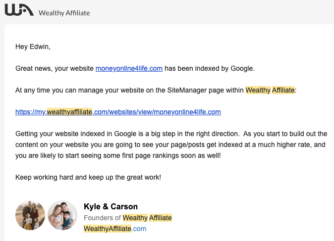 Selecting a niche, then a domain, then building our site and adding content are all necessary, but that message that our site has been indexed is the first acknowledgement of our efforts from the "outside world".