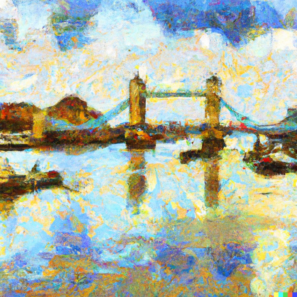 A painting of the River Thames by the Tower Bridge in the style of an English Impressionist artist