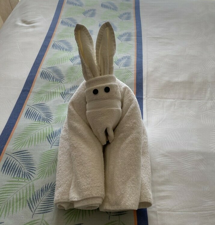 When we return to our room each day we are greeted with a newly made creation that our room steward makes us. Our first one I believe was a rabbit. You be the judge and tell me if I'm right!