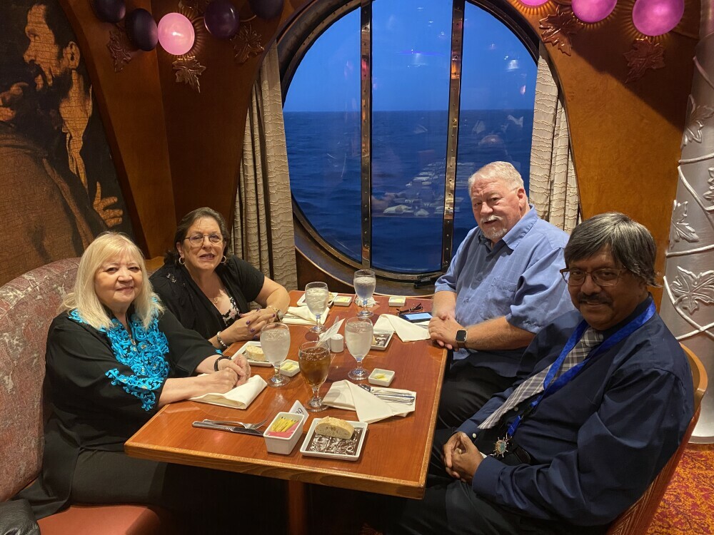 My wife and I in the foreground for the first time are sailing with younger friends in the background. This is turning out to be so much fun! This picture was taken by a dining room staff member who has been assigned to serve us at our table.