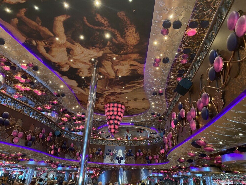 The two-level dining room is called Bacchus named for the Greek God Of Wine and Vegetation. It is over the top in decor as you can see in this shot I took of the ceiling. Not my cup of tea having all those faux grapes haning over us!