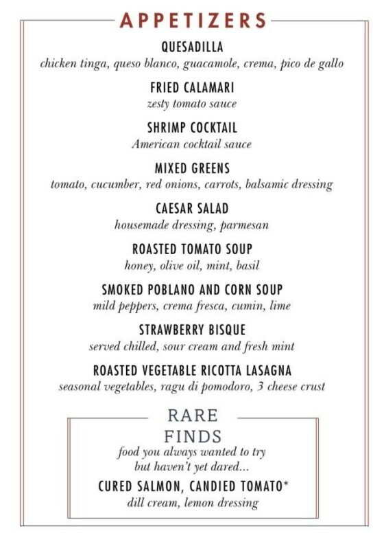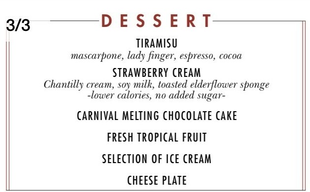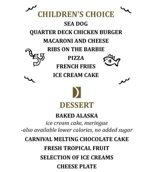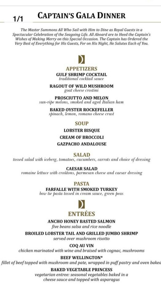 I'm going to show you a typical dinner menu for a normal day as well as for a formal evening. All dinners comprised of appetizers, entrees, and desserts. Choices were plentiful. If you preferred any item you could order more of it. Each day had a new menu.