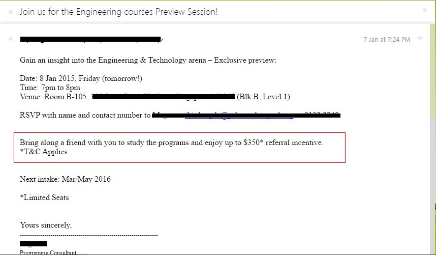 There we go! S$350 per sale if I can refer a friend to join Engineering course in my college.