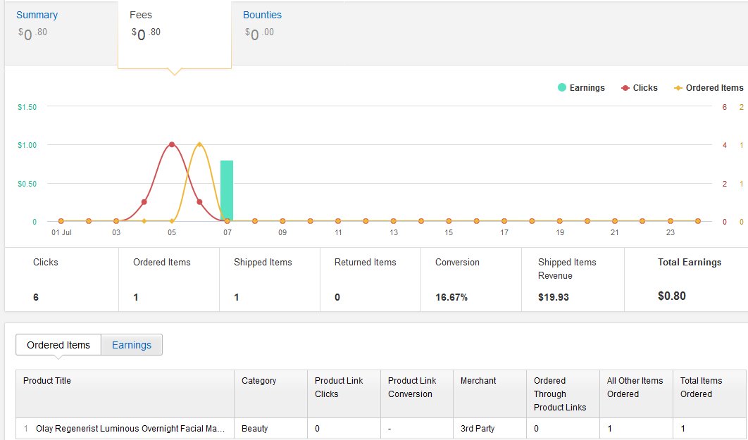 With just less than a week to go to my Amazon account's cancellation, she did indeed come to my rescue. She went through my website and ordered some Overnight Facial Mask Gel Moisturizer worth $19.93 and I was credited with a $0.8 commission. See below screenshot: