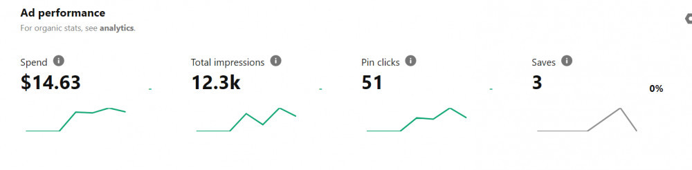 So far I have had 12.3k impressions on these advertisments on pinterest and a few extra visits to my site and clicks on my affiliate links and am seeing a slight increase in traffic with my sites views since I started on pinterest sitting between 10-25 in the past few days.