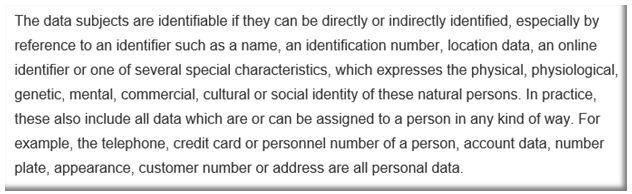 The GDPR is specific to personal data and the processing of personal data – this includes the storage of, the exporting of, the sharing of, and transactional use of, personal data. The GDPR is specific to ONLY personal data, meaning that if I use the name Dave when making a blog post – that is NOT personal. Sure it’s personal to me, but it doesn’t tell you my last name (even if it did, it’s still at that point – NOT PERSONAL). There is absolutely nothing to connect you (the owner of a blog) to me (the reader of your blog). You don’t know my address, my telephone number, my birthdate, my medical number – nothing! See the snippit below from the GDPR on what exactly is personal data: