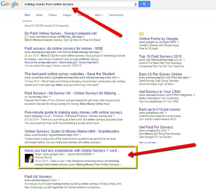 Hi guys, I just wanted to post some proof that having a Google+ account & commenting/posting on there about your new posts really DOES get you up there in the search results with Google. My main blog is only about 2 months old & I was just checking by using the keywords I had chosen for two different posts