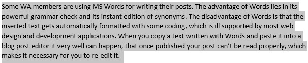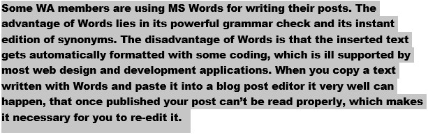 Some WA members are using MS Words for writing their posts. The advantage of Words lies in its powerful grammar check and its instant edition of synonyms. The disadvantage of Words is that the inserted text gets automatically formatted with some coding, which is ill supported by most web design and development applications. When you copy a text written with Words and paste it into a blog post editor it very well can happen, that once published your post can’t be read properly, which makes it necessary for you to re-edit it.