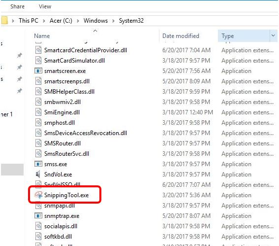 Once you are inside System32 scroll down till you find “SnippingTool.exe”. It is imperative that you find it by scrolling down. Any other way to find it will not let us attach it to the taskbar.