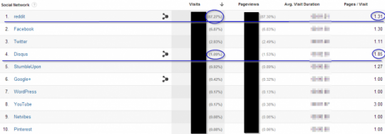 Hopefully you can see that but if not. It says Reddit accounts for 87.27% of my social visits and gets 1.31 pages per visit. (See? 80/20! It never fails.) Further down it says Disqus accounts for 1.09% and 1.85 pages per visit.