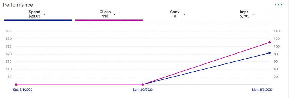 Just started this campaign yesterday (Sunday, August 2, 2020) and got 110 clicks already, from here is just a matter to refine the keywords and the ads. Bing searchers are like wolves, always hungry.