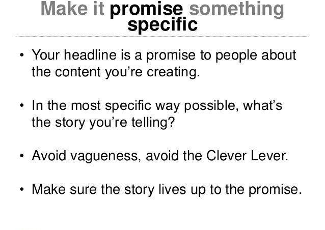 Headlines need to convey as much essential information in as few words as possible. The best-written headlines will give enough detail to be absolutely clear, while still leaving room for intrigue. Write headlines for your readers, not to show you’re clever. Resist the temptation to use your headlines to talk about how awesome you are.