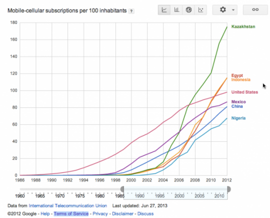 Look at this graph... it gives you the number of mobile subscriptions per 100 inhabitants of six different countries. Most people are surprised when they see that the US isn't at the top of the pile - but many of the less developed nations have bypassed the 'fixed network' stage that we went through and have gone straight to mobile.