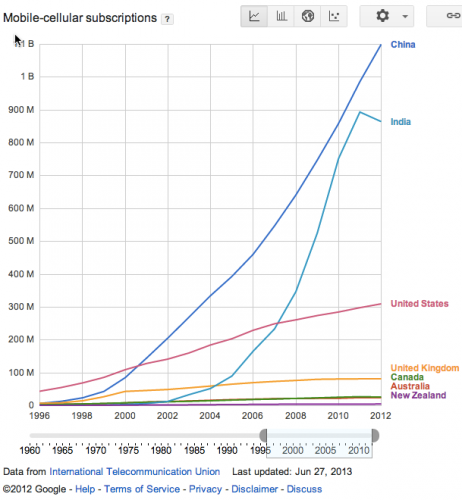 There we go - the number of mobile phone subscriptions in India is more than the combined total of the 5-anglo countries (US, UK, Canada, Australia and New Zealand). There were 1.1 billion mobile subscriptions in China in 2012. 1.1 BILLION! And many of those will be smart-phone capable (see my previous blog on the march of Mobile in your future)