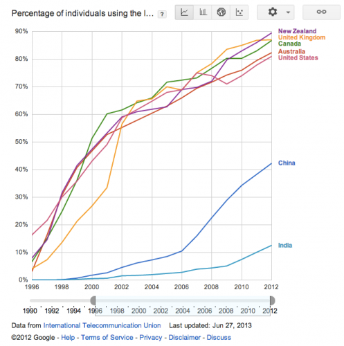 This is the percentage of individuals using the internet. OK, we know we are ahead of the curve on this - but by the end of this decade India and China will have played catch-up. But even now. What is 42% of 1.35 billion people .... hmmm how about 500 million people online in China alone.