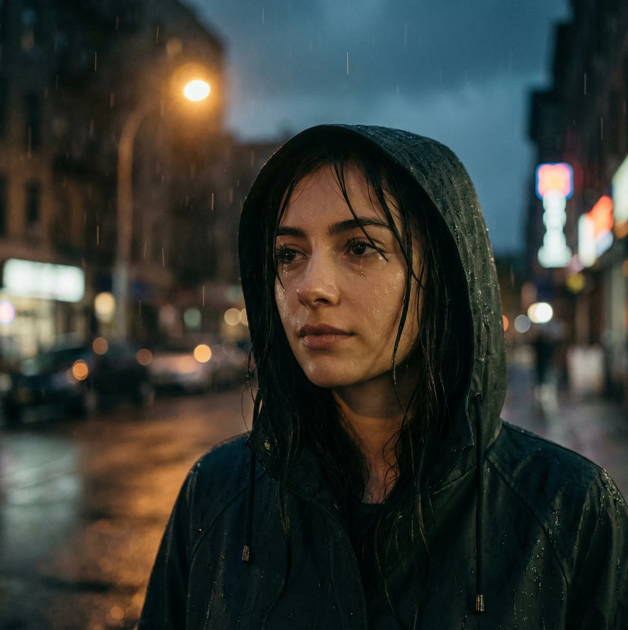 Cinematic Female Portrait:A hyper-realistic cinematic portrait of a young woman standing in light rain at night, soft raindrops falling naturally, realistic skin texture, preserved facial identity from uploaded photo, shallow depth of field, moody lighting, wet hair strands, reflective highlights on skin, emotional and calm expression, cinematic color grading, high realism
