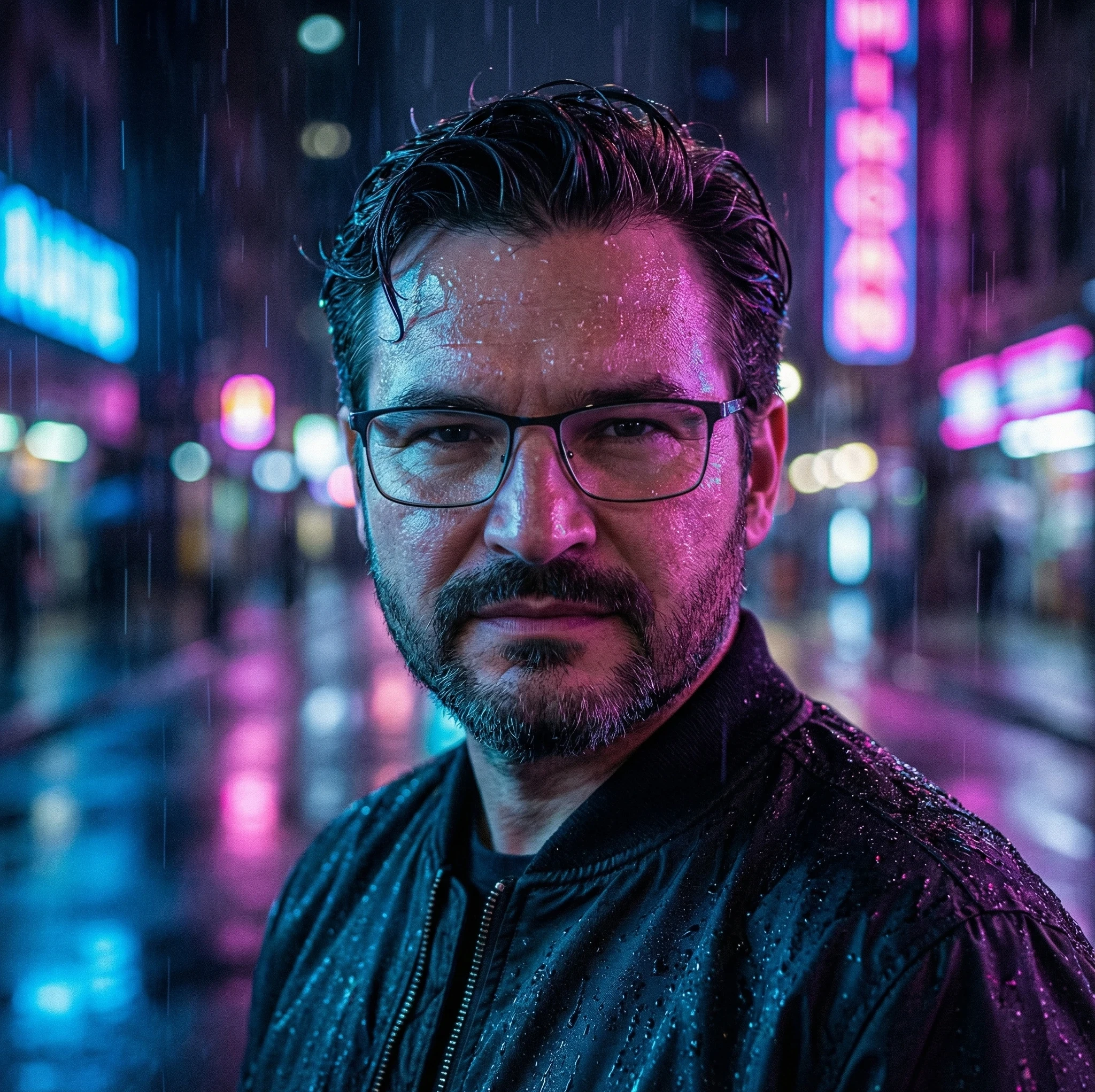Contemporary cinematic portrait of a stylish young man in city rain at night. His hair is fashionably wet and styled, with rain droplets on his face catching neon lights. Wearing a modern black bomber jacket with rain beading on the water-resistant material. His expression is confident and intense, looking directly at camera. Dramatic rim lighting from colorful neon signs creates blue, pink, and purple reflections on wet surfaces. Urban street setting with blurred bokeh lights and wet pavement reflections. Shot in ultra-realistic 8K with film grain texture.