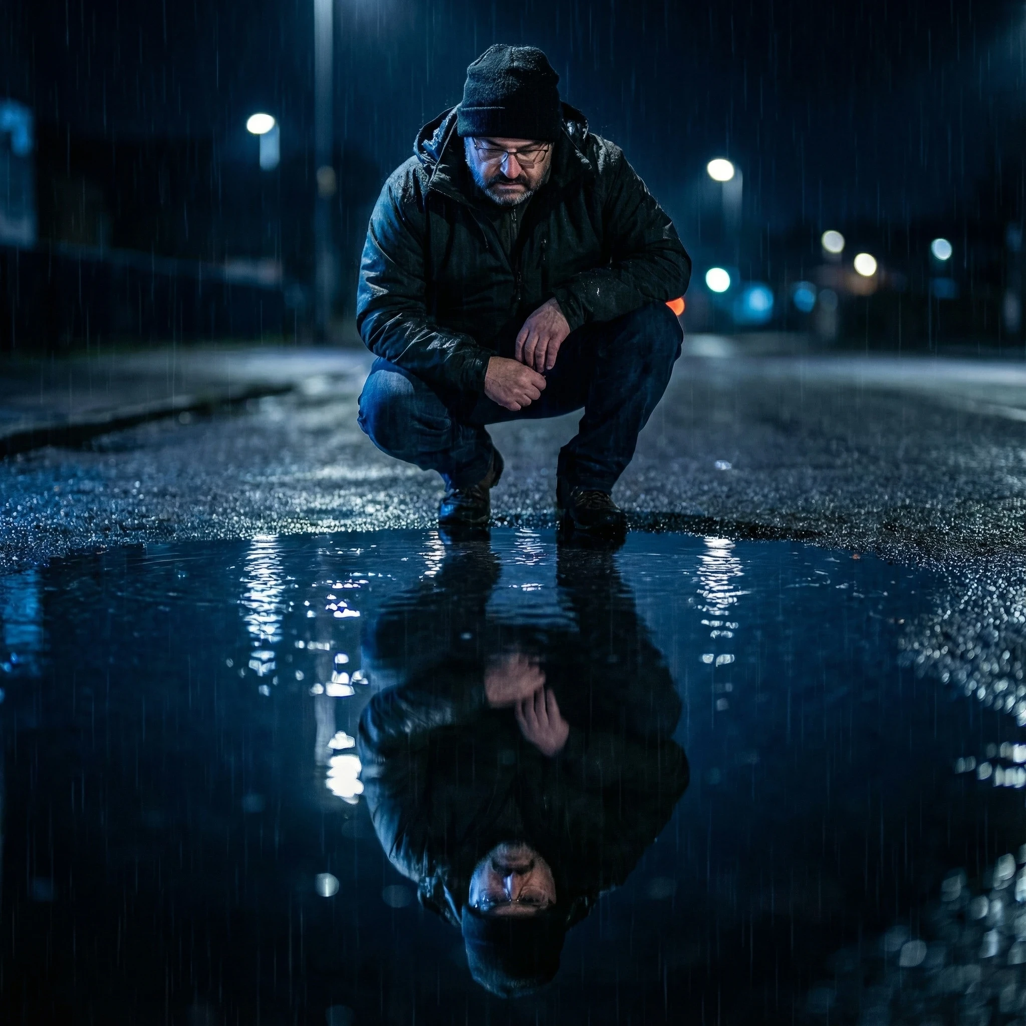 Use this photo. Deeply artistic portrait using rain and reflections creatively. Subject crouches near large puddle in rain at night, their face and upper body reflected perfectly in the water creating mirror-image effect. They're looking down at their reflection with contemplative expression. Wearing simple dark clothing, hair wet from rain. Artistic lighting creates symmetry between reality and reflection. Rain ripples occasionally disturb the mirror effect. Background is minimal and dark, all focus on the dual image. Shot in 8K with composition emphasizing the symmetry. Moody color grading with emphasis on blues and shadows. aspect ratio: 16:9