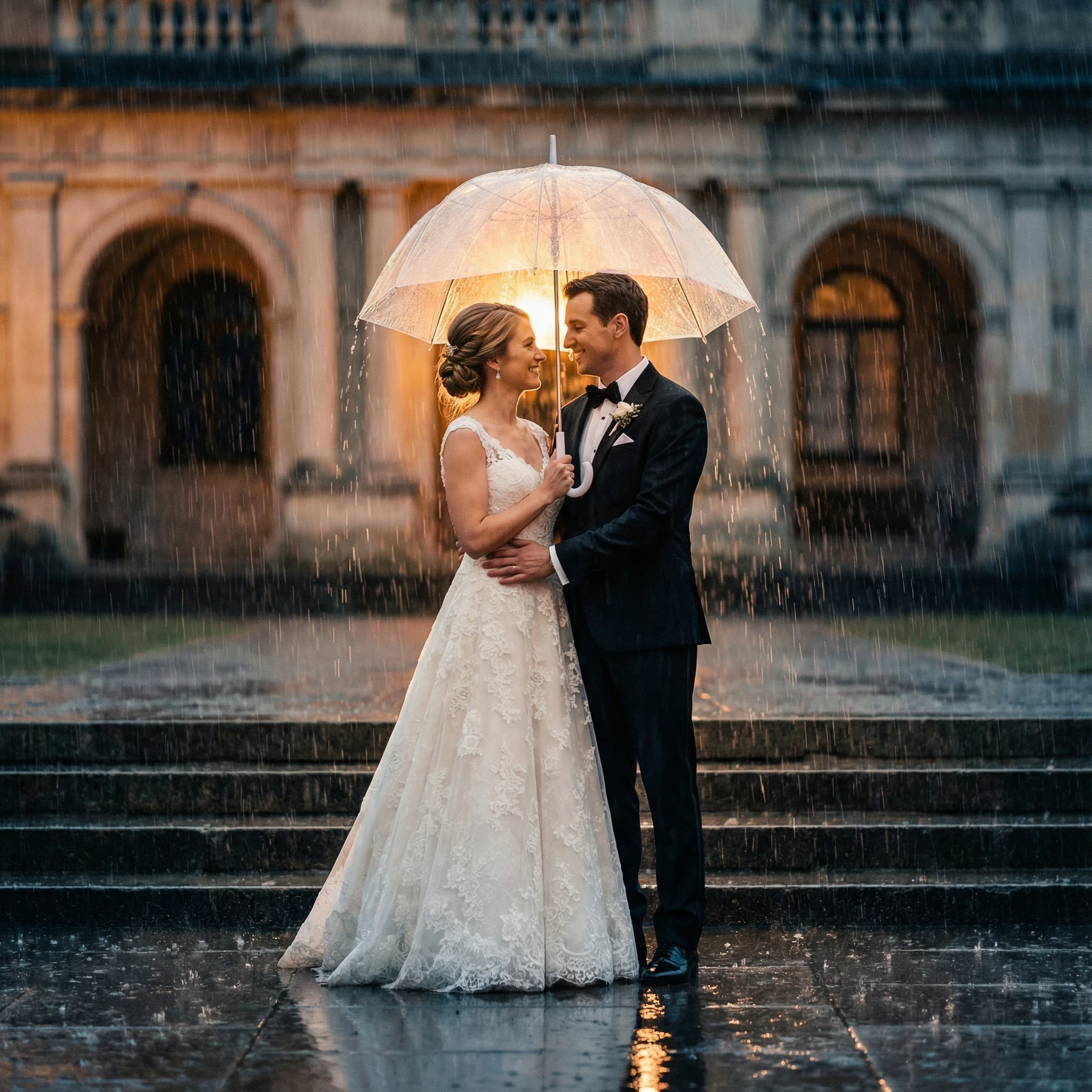 Classic elegant wedding portrait of bride and groom under vintage transparent umbrella in rain. Bride in timeless A-line wedding gown with sweetheart neckline, groom in classic black tuxedo. They stand close, his arm around her waist protectively. Rain creates romantic curtain effect around the umbrella. Formal venue architecture visible in soft-focus background. Warm romantic lighting highlights their faces under the umbrella while cool rain falls around them. Wet stone steps create elegant reflections. Shot in 8K with composition following rule of thirds. Sophisticated color grading with warm interior and cool rain tones. Apect ratio: 9:16