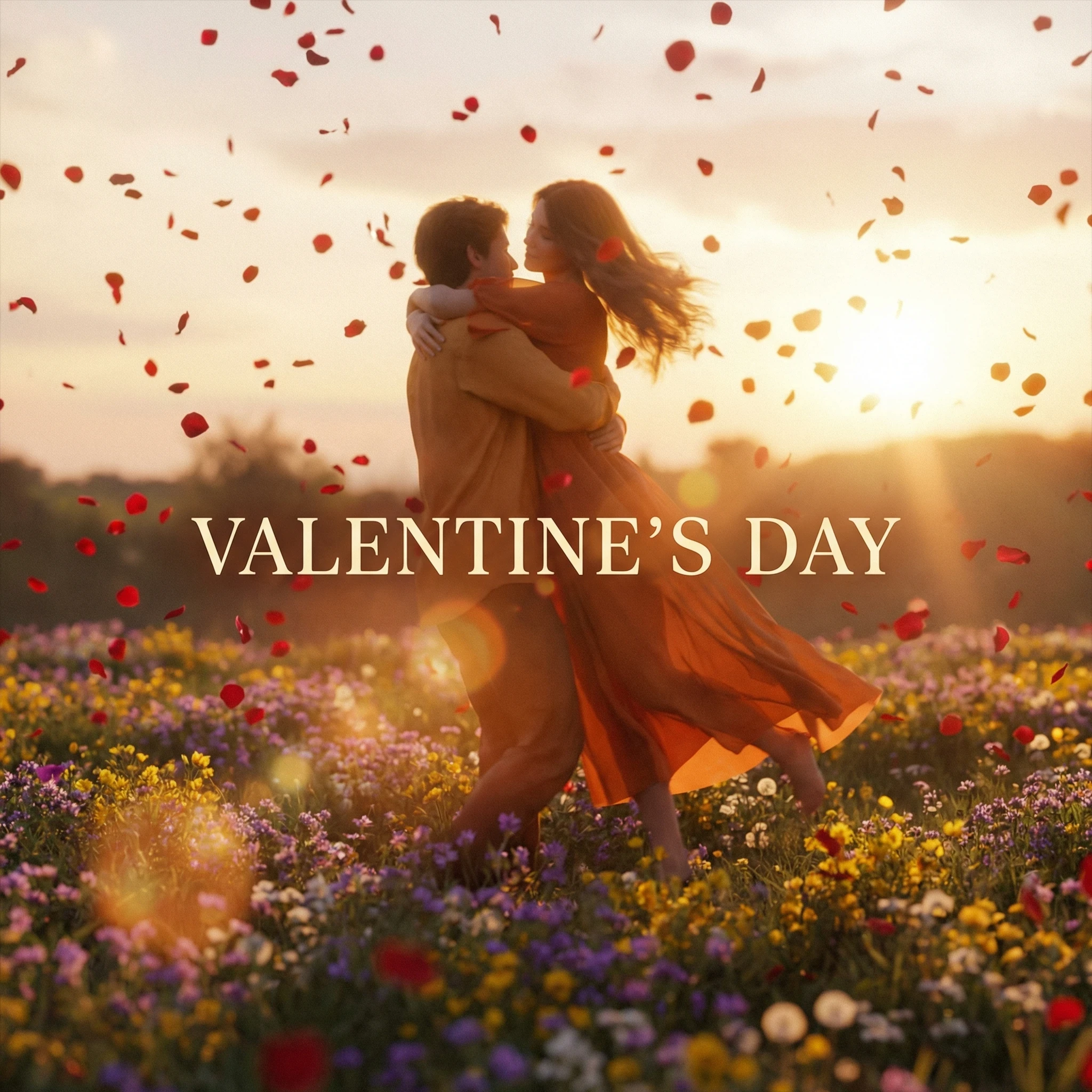 Couple Dancing In WildflowersA slow-motion sequence of a couple dancing in an open field filled with wildflowers as rose petals drift around them, soft-focus cinematography, golden-hour lighting, and warm lens flares blending with a romantic orchestral feeling, celebrating Valentine's Day through movement and emotion.