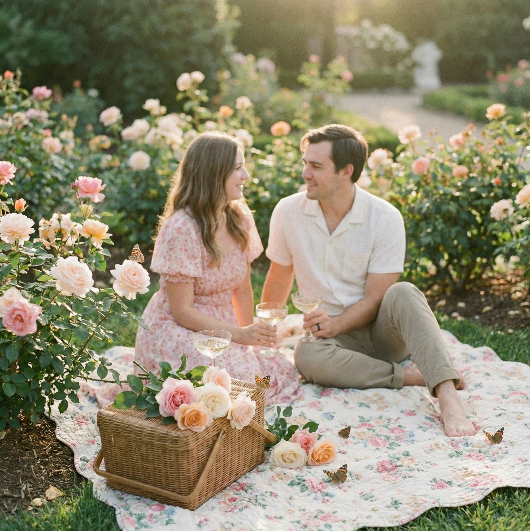 A dreamy Valentine's garden picnic set among blooming roses, a vintage blanket and picnic basket laid out, champagne glasses reflecting the sun, subtle butterflies floating around, the couple lost in conversation under soft lens blur, with pastel cinematic grading emphasizing serenity and intimacy, I didn't like the first result, so I asked Image Studio to zoom out the image so I can see the persons.