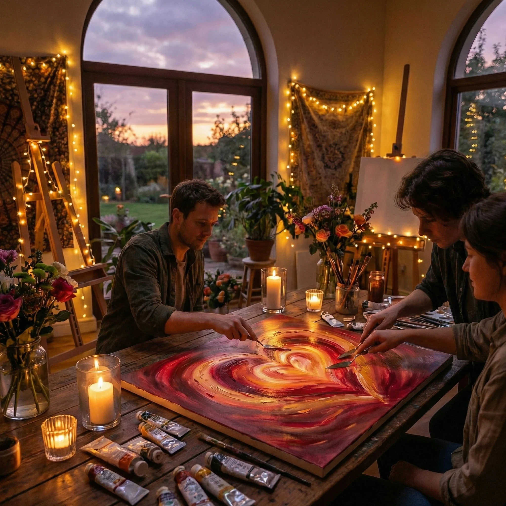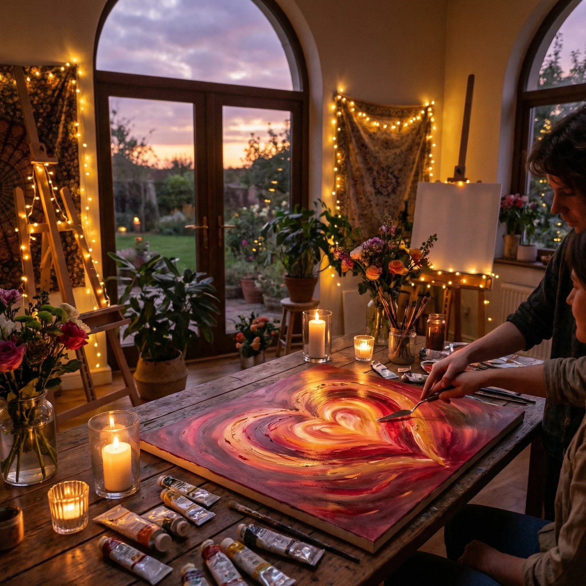 A candlelit indoor scene of two lovers painting on a single canvas together, hands touching as they mix vibrant colors into a glowing heart shape, sunlight fading outside large windows, the room filled with flowers and soft string lights, symbolizing artistic love and creative connection, also here I had to ask Image Studio to zoom out. Still I don't understand, where I went wrong.