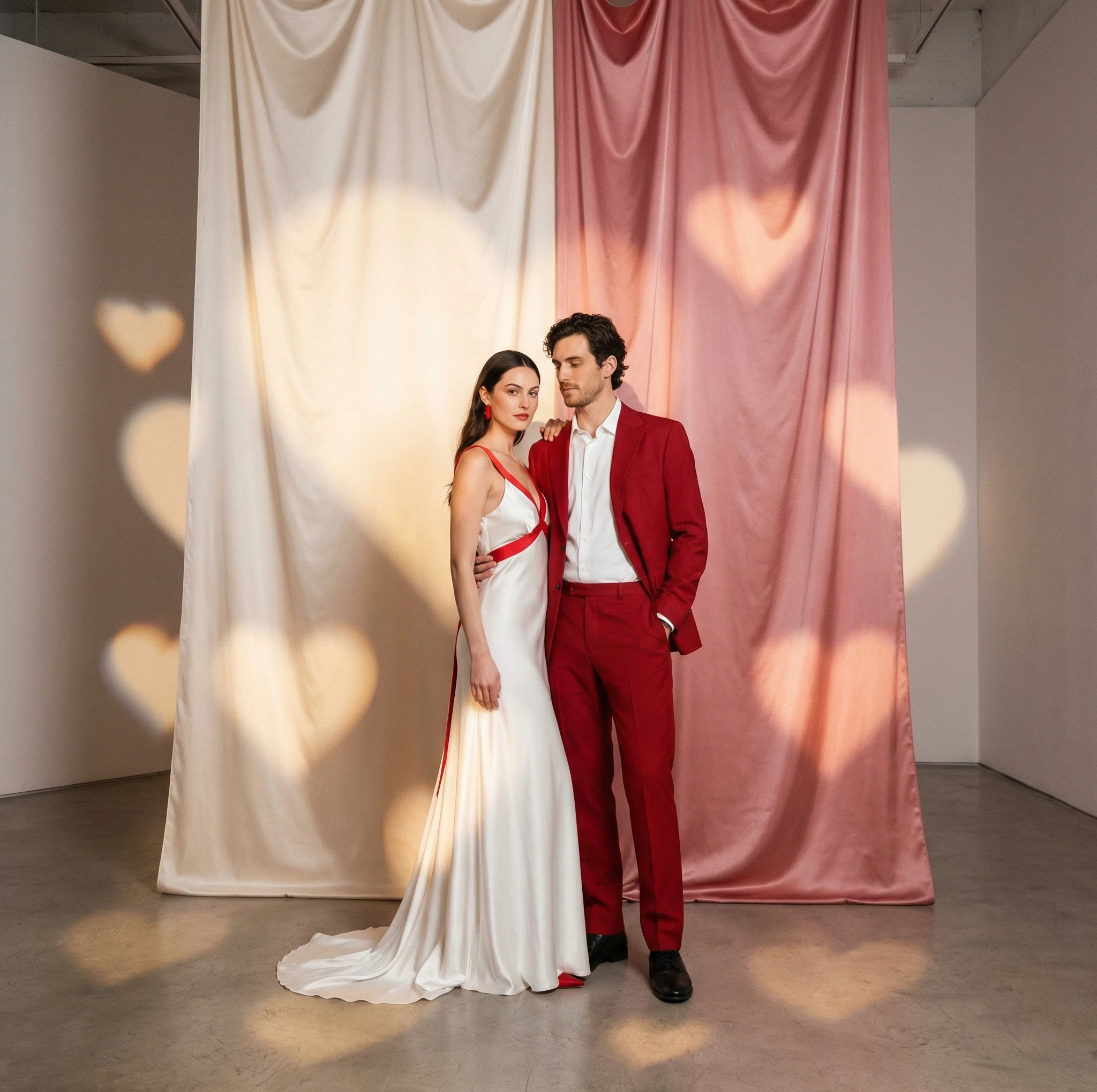 A fashionable Valentine editorial-style shoot featuring a stylish couple posing in elegant red and white outfits against a minimalist backdrop of billowing silk fabric and heart-shaped lighting projections, channeling modern aesthetics, sleek composition, and refined romantic energy.