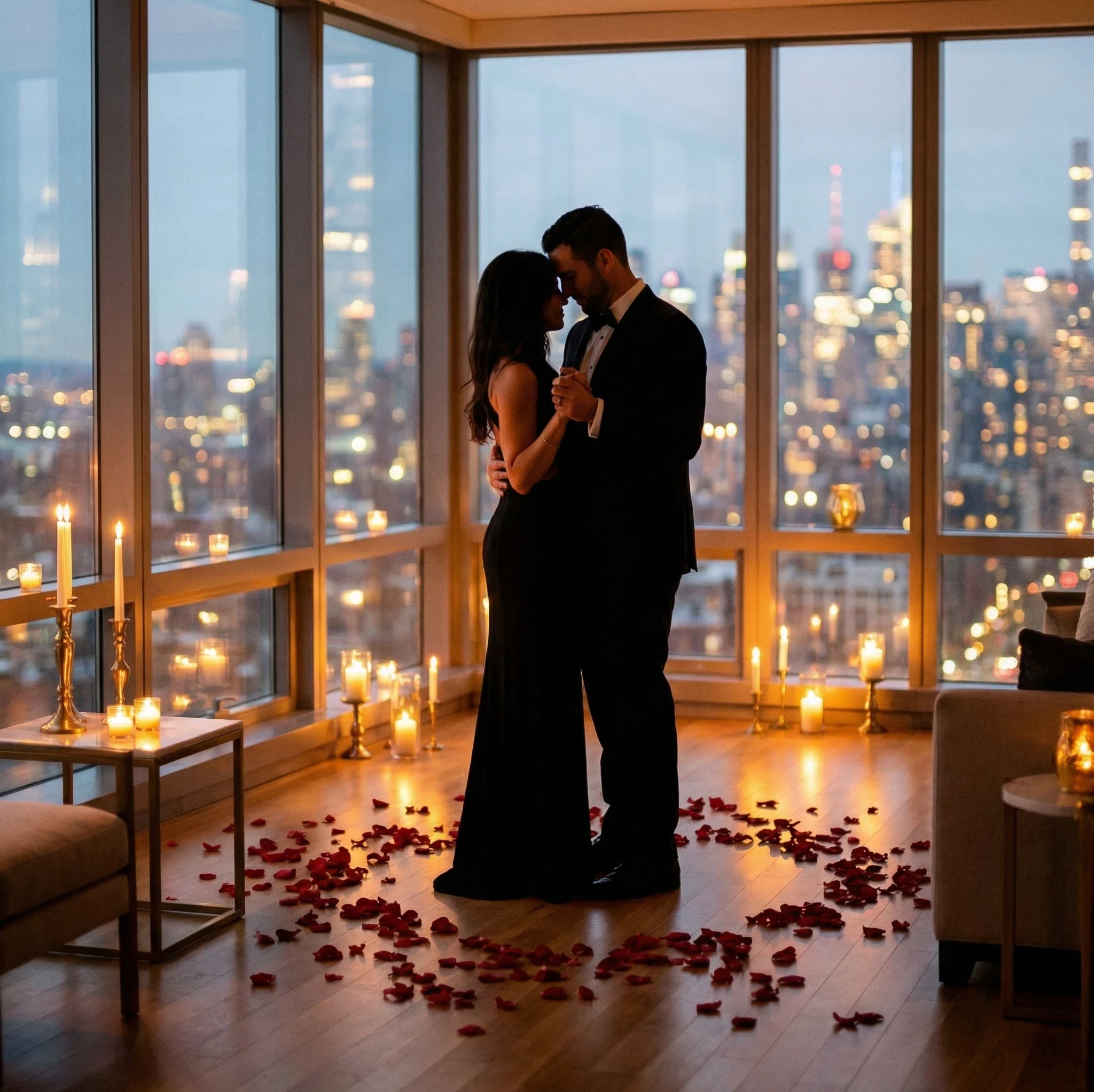 A luxurious Valentine's evening scene in a high-rise apartment with city lights in the background, soft candlelight and red petals on the floor, the couple dressed in elegant attire dancing slowly in silhouette near large windows, golden reflections and shallow depth capturing sophistication and emotion.