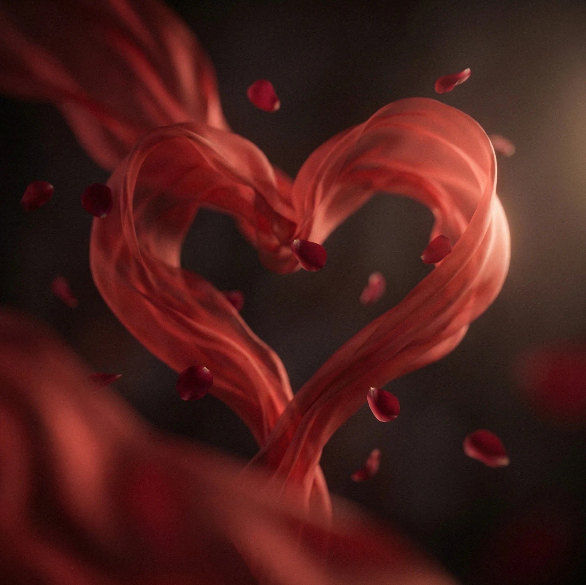 A minimalist Valentine's concept visualizing love through abstract red silk cloths swirling in slow motion, merging into the shape of a heart in midair, surrounded by floating petals, with moody cinematic lighting and elegant depth-of-field transitions emphasizing purity and emotion.