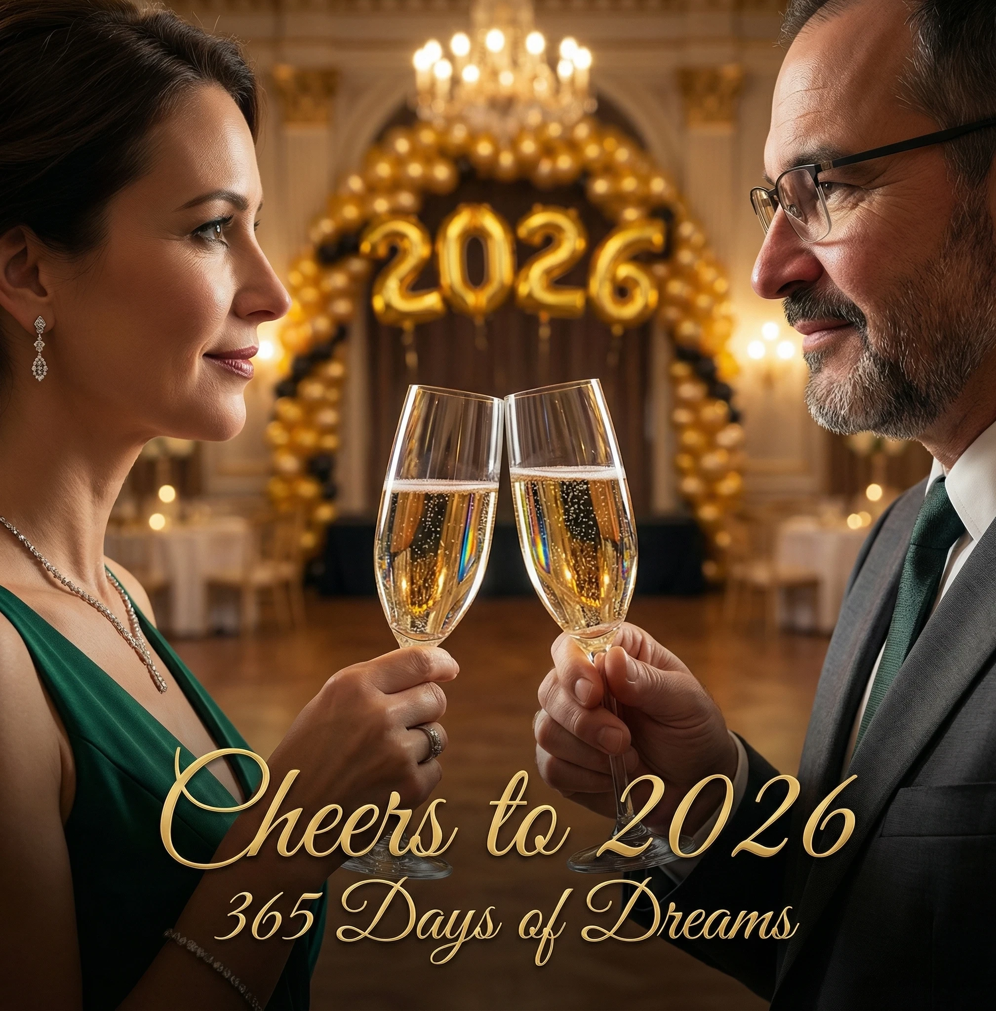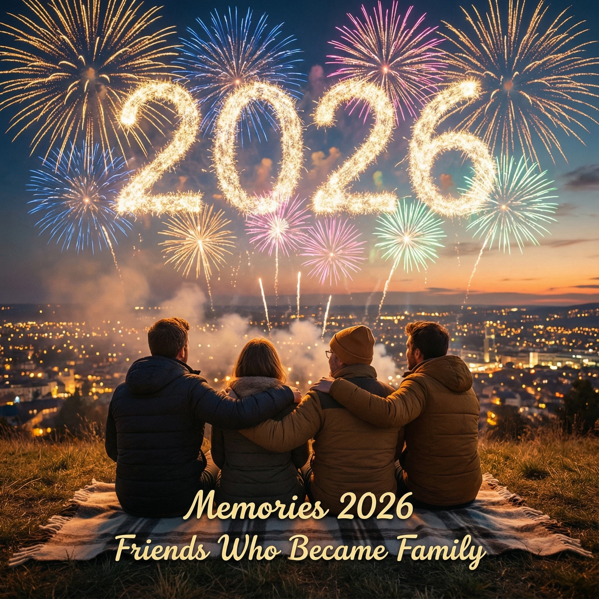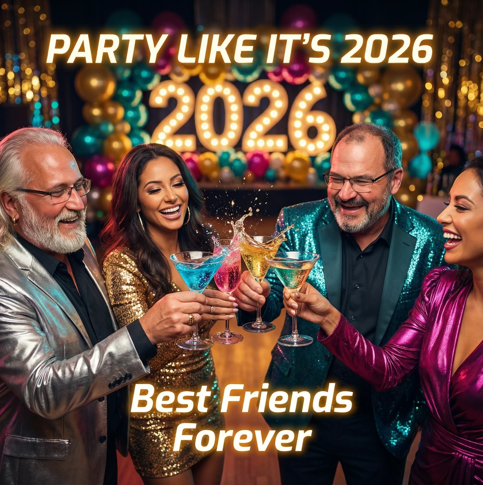 A cinematic photograph capturing the moment a group of 3-4 close friends (maintain all uploaded faces precisely) clink their colorful cocktail glasses together in celebratory toast at an elegant party venue. Shot from slightly above at 45-degree angle showing their glasses meeting in center with liquid splashing artistically. They wear stylish party outfits with sequins and metallics. Background shows bokeh party lights in gold, teal, and magenta with "2026" balloon installation visible. Text overlay: energetic modern font "PARTY LIKE IT'S 2026" and "Best Friends Forever". Dramatic cinematic lighting with sparkle effects, 8K resolution, photorealistic glass and liquid physics, new year party theme, center-focused composition with radial energy, vibrant saturated colors, pure joy captured.