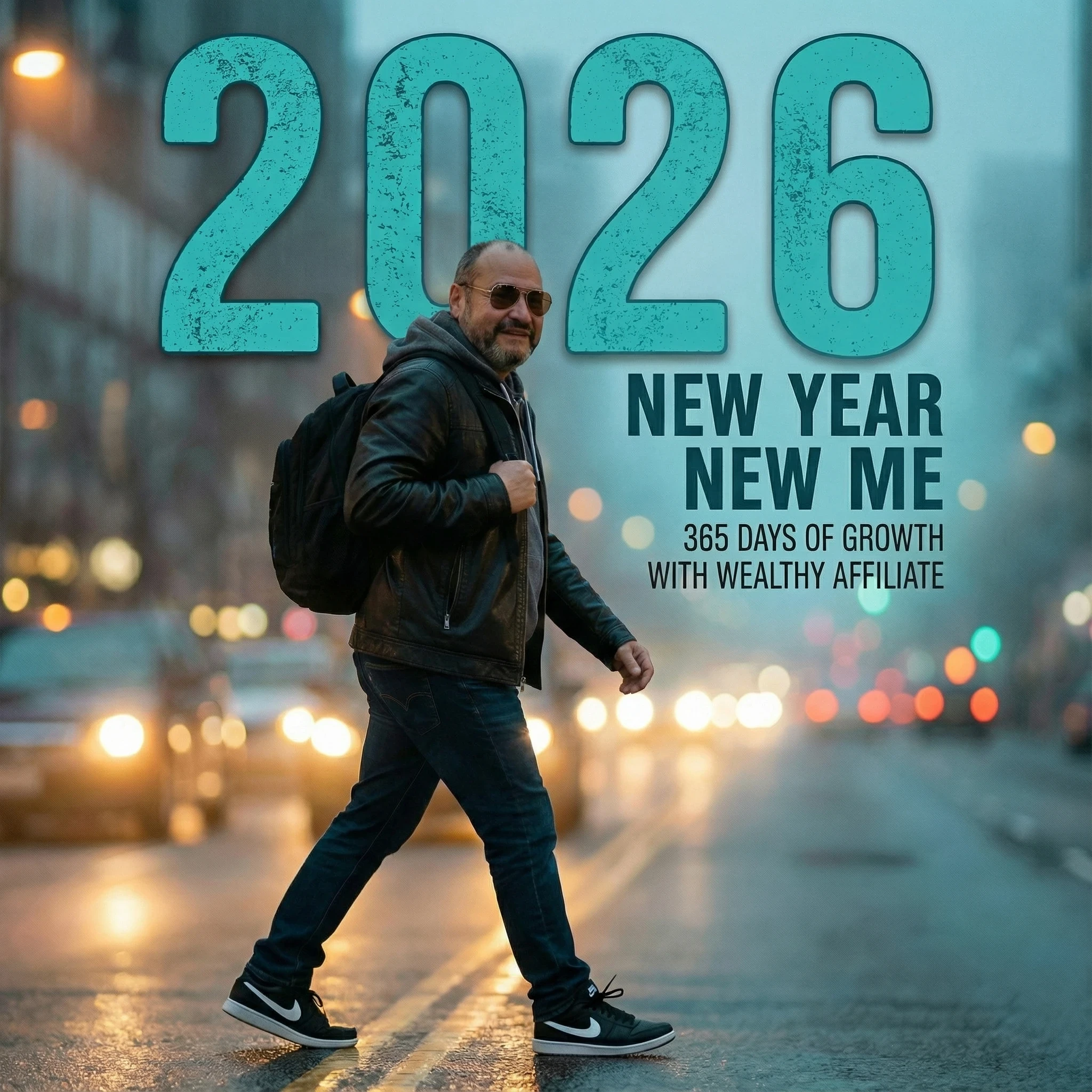 A photorealistic cinematic shot of a young man (uploaded face 100% accurate) walking confidently from left to right through urban city street at dusk. Wearing stylish black leather jacket over gray hoodie, dark blue jeans, black backpack on left shoulder, aviator sunglasses. Background features soft blurred cityscape with bokeh lights and misty teal-blue atmospheric haze. Large bold text overlay: "2026" in distressed teal-cyan font, smaller text: "NEW YEAR" and "NEW ME" with "365 DAYS OF GROWTH" subtitle. Cinematic lighting with warm street lights, highly detailed 8K, photorealistic urban style, new year transformation theme, dynamic walking pose, rule of thirds composition.