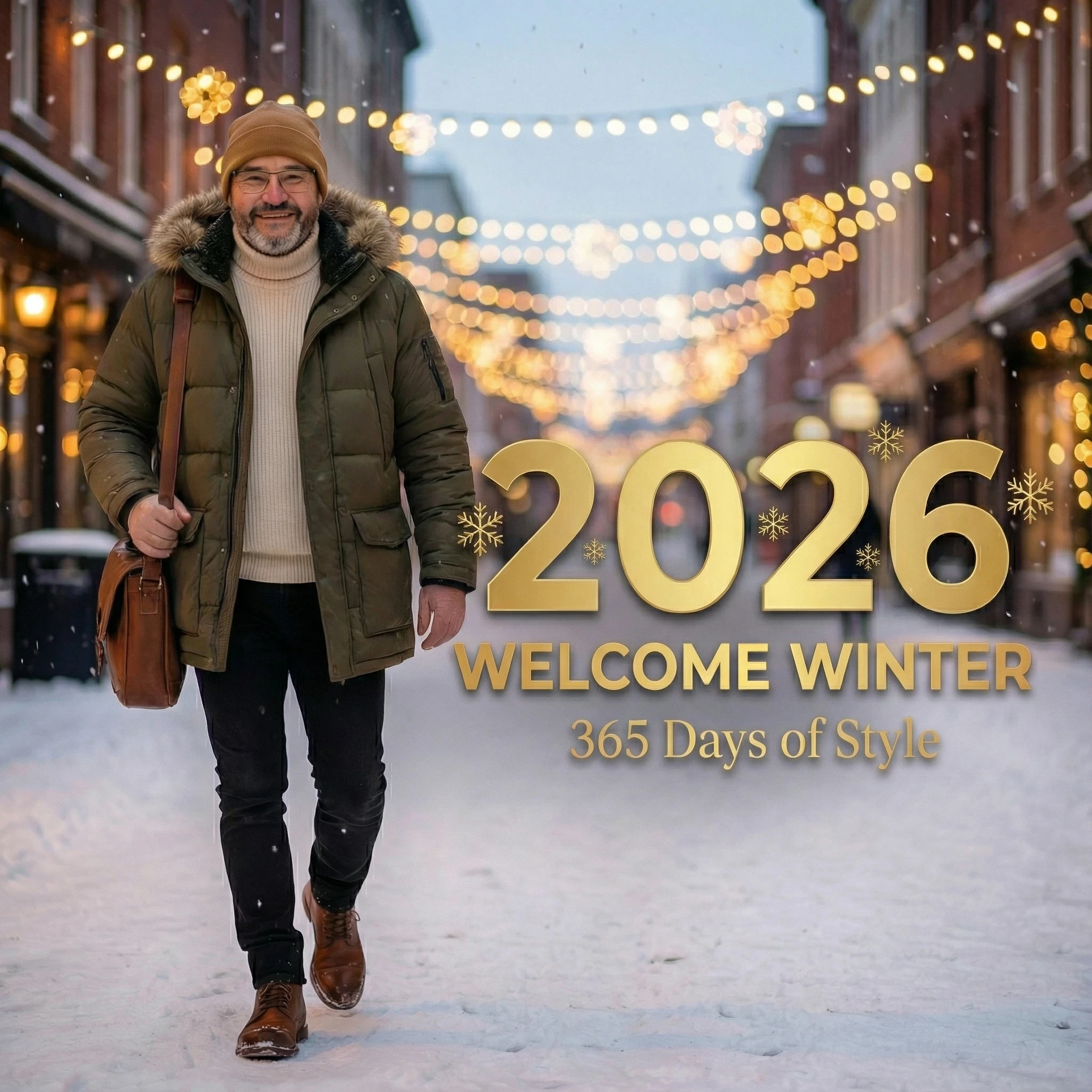 Hyper-realistic photograph of a fashionable young man (uploaded face unchanged) walking through a snowy urban street with soft falling snowflakes. He wears a premium olive green puffer jacket with fur-lined hood, cream turtleneck sweater, black slim-fit jeans, brown leather boots, carrying a brown leather messenger bag. Warm string lights decorate the street creating magical bokeh. Large gold text overlay: "2026" with snowflake accents, subtitle "WELCOME WINTER" and "365 Days of Style". Cinematic warm lighting contrasting with cool snow, 8K ultra-detailed, photorealistic winter textures, new year fashion theme, shallow depth of field focusing on subject, cozy yet confident atmosphere.