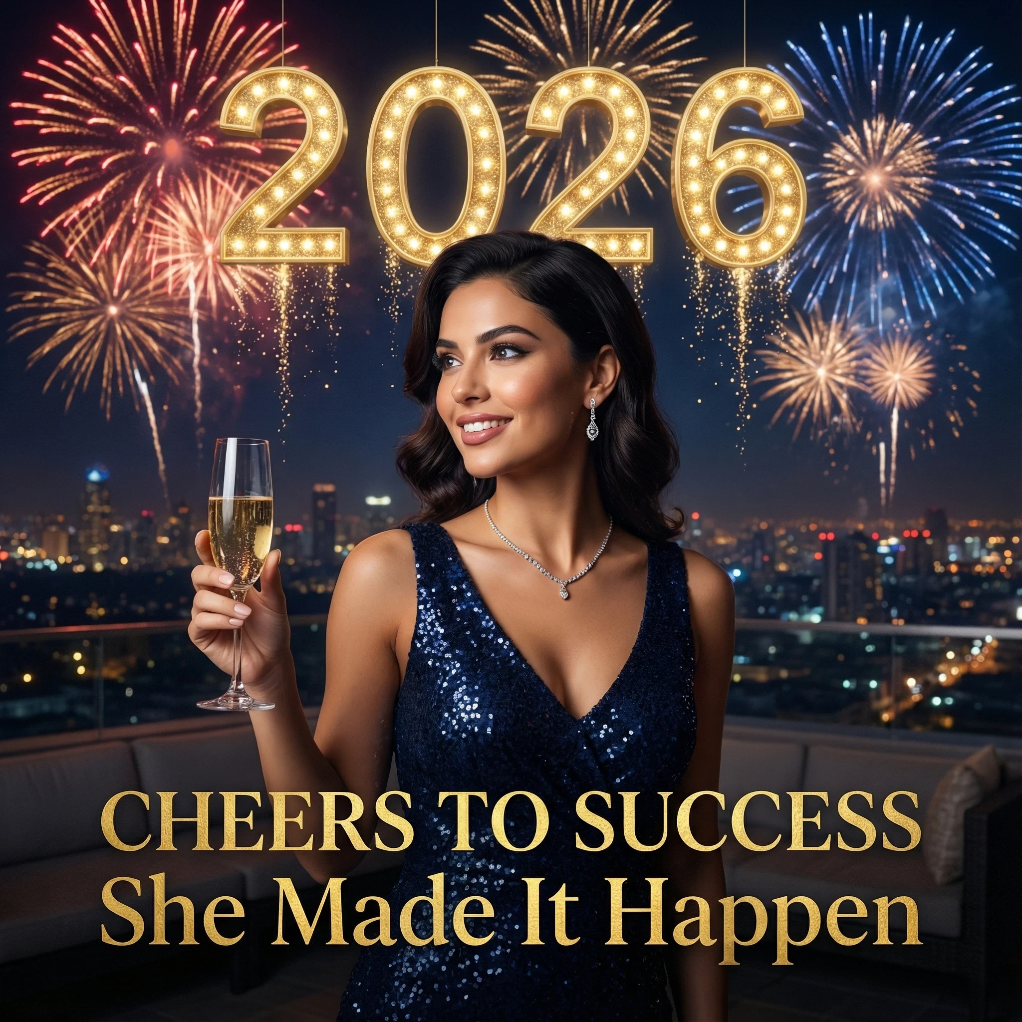Hyper-realistic photograph of an elegant young woman (maintain uploaded face precisely) standing on a luxury rooftop terrace at midnight with spectacular fireworks exploding in the sky behind her. She wears stunning midnight blue sequined cocktail dress, delicate diamond jewelry, holding champagne flute gracefully. City skyline glitters with millions of lights below. Massive golden "2026" illuminated in the sky with cascading golden sparkles. Text overlay: luxurious gold foil effect "CHEERS TO SUCCESS" and "She Made It Happen" in elegant serif font. Dramatic cinematic lighting with soft fill light, 8K resolution, photorealistic jewelry detail, new year achievement celebration theme, powerful confident pose, sophisticated color grading.
