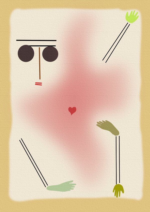 What do you see? Right in the center of this fully "orchestrated" human entity there's a pulsating heart. Whatever I percieve, consider or do, it recieves its meaning, power and beauty through the active presence of the heart, through my readiness and empathy. So the name of the tableau is: "Having Head, Hand, Foot and Heart."