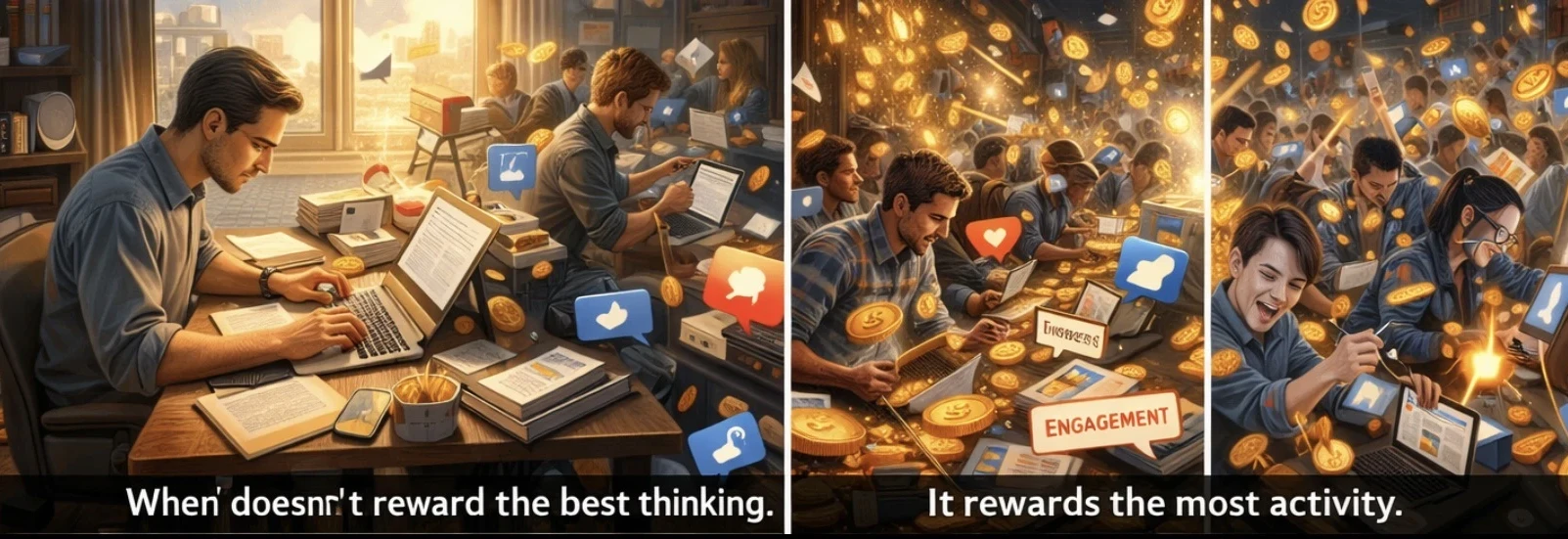 They collapse because the system quietly teaches everyone that noise pays better than thought...