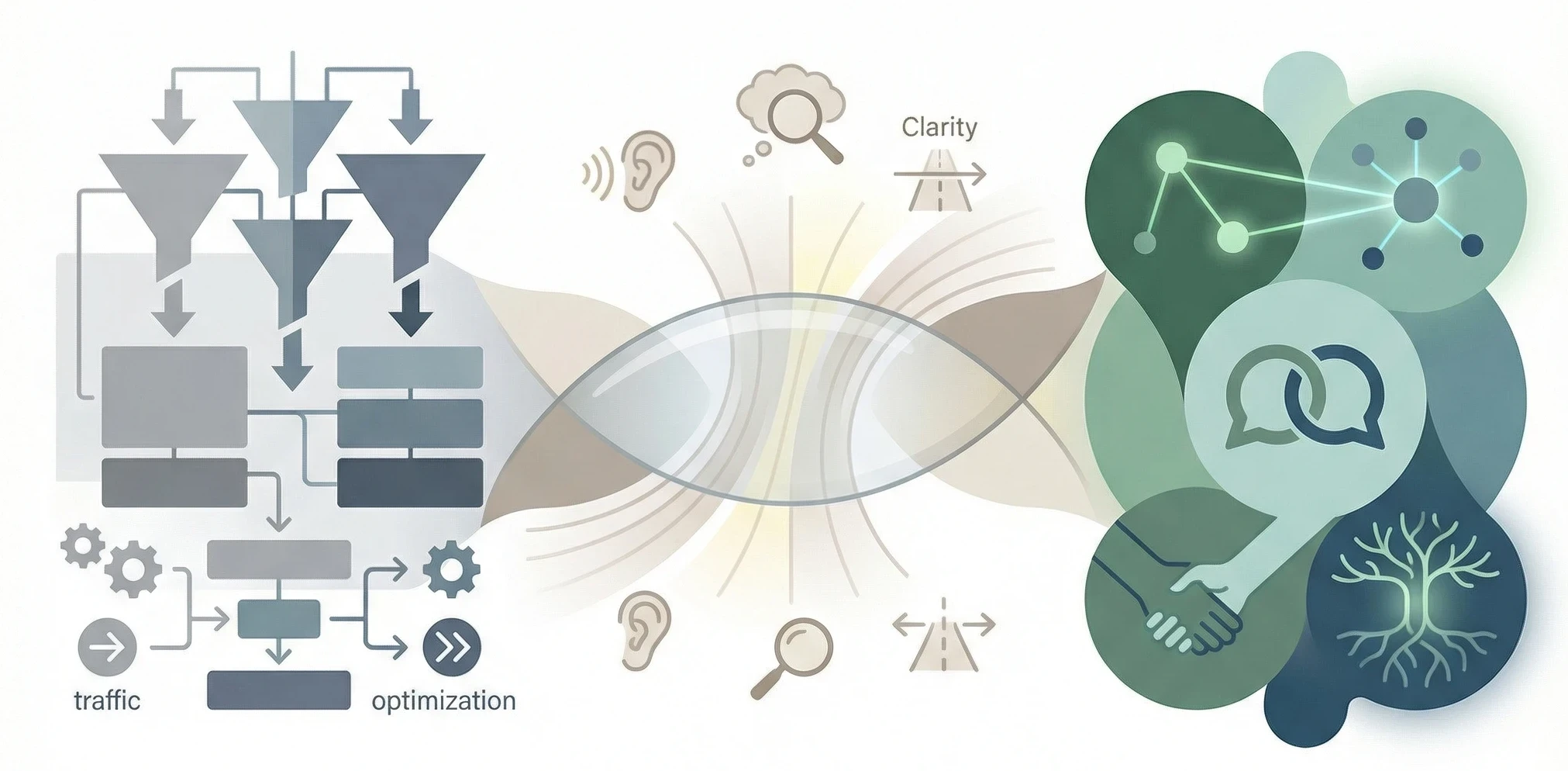 Abstract funnel shapes, structured blocks, arrows, muted gray and cool blue tones, minimal icons suggesting traffic and optimization.