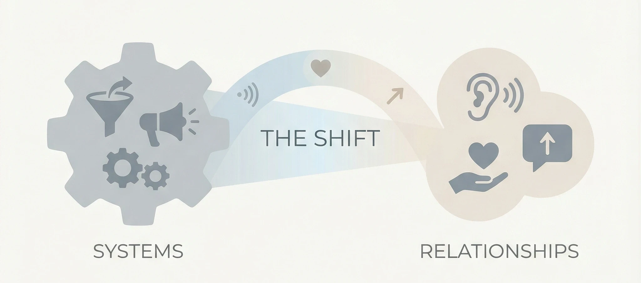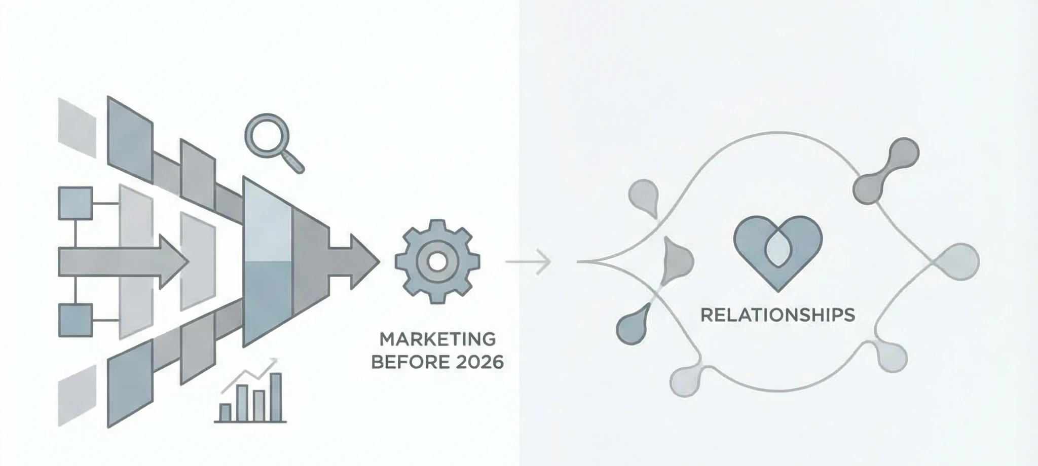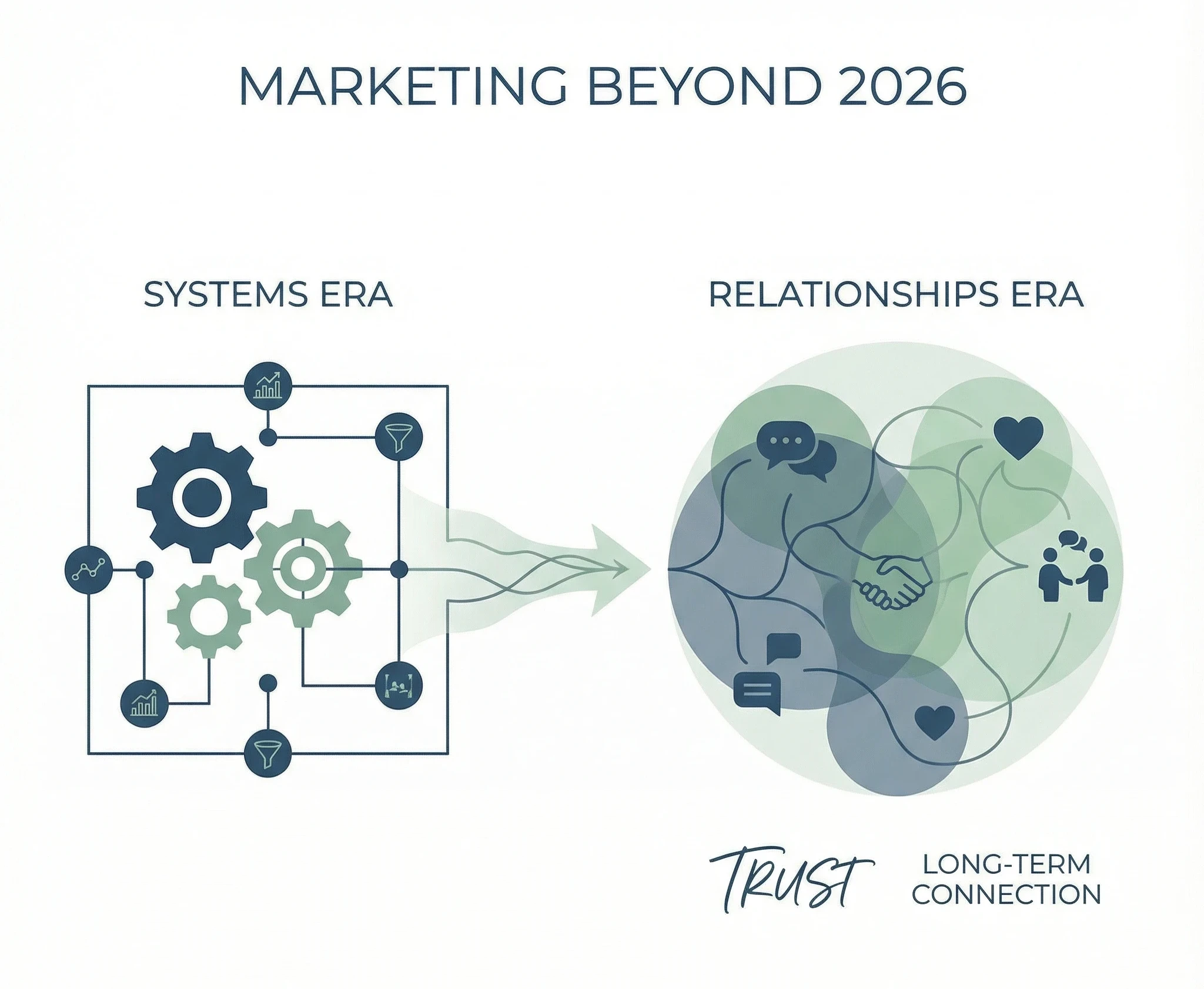 A clean, modern conceptual illustration showing the evolution of marketing from systems to relationships.